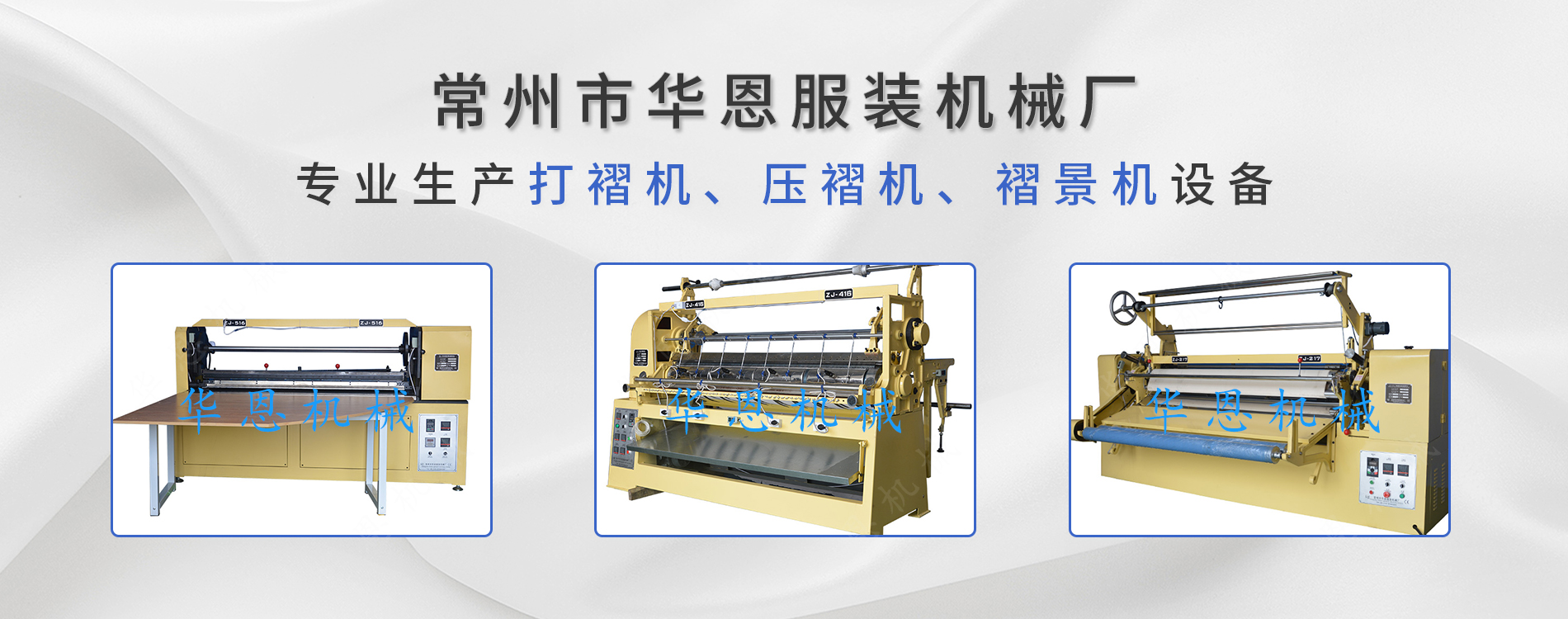 常州市華恩服裝機械廠是一家專業生產打褶機,打折機,壓褶機,褶景機設備的廠家,由本廠研制開發的ZJ-系列各類摺景機是用于各種人造和混紡面料的打褶及熱定型的設備。