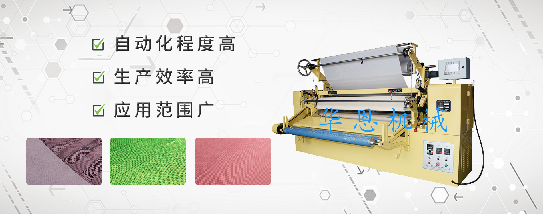 常州市華恩服裝機械廠生產的機器能摺出各種花色繁多、新穎別致的面料,加工定型后的面料立體感強、美觀大方。 使用本機能使各類服裝、時裝、裝飾布、床上用品、窗簾等產品增加品種,式樣迅速翻新,以快的速度適應市場的需求。